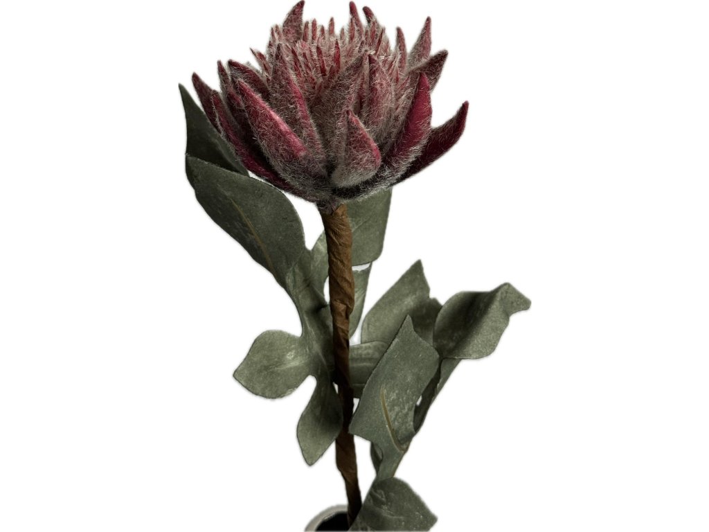Výrazný květ doplňují zelené dekorativní listy, které podtrhují exotický vzhled celé větve. Díky své velikosti je ideální jako solitér do moderní vázy nebo jako součást výraznějších aranžmá v kombinaci s proteou, banksií či eukalyptem.