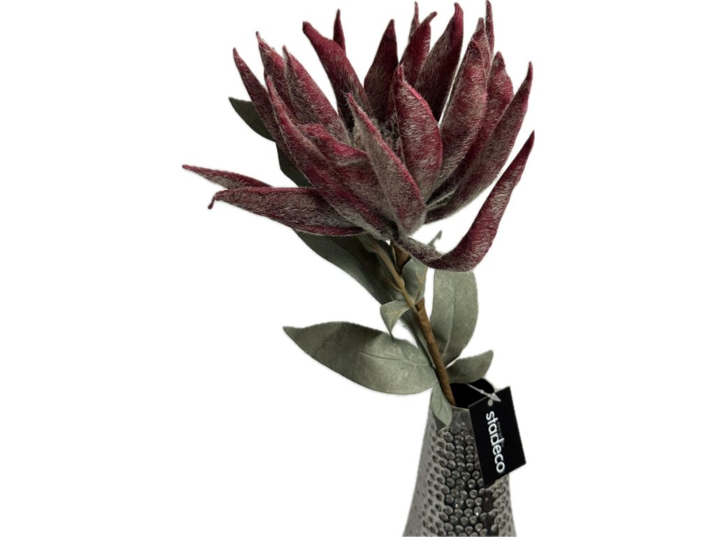 Výrazná struktura květu dodává aranžmá hloubku a zajímavý designový prvek, zatímco zelené listy podtrhují exotický charakter celé větve. Květina je ideální jako solitér do moderní vázy nebo jako součást přírodně laděných kompozic v kombinaci s eukalyptem, proteou či travinami.