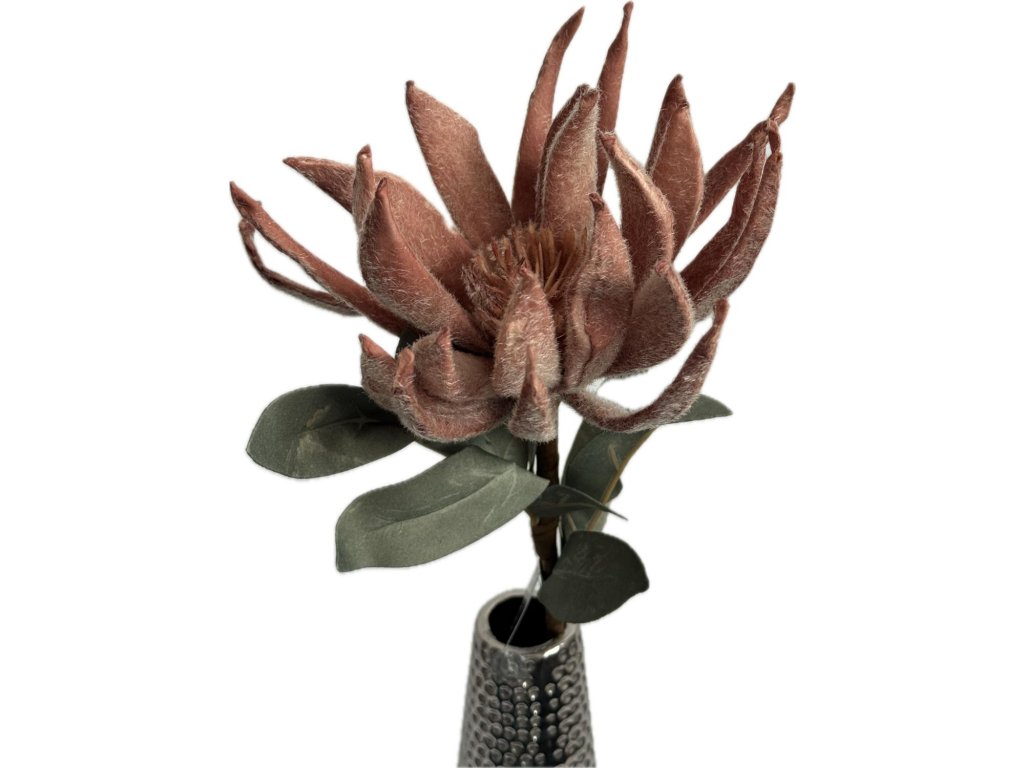 Výrazná struktura květu dodává aranžmá hloubku a zajímavý designový prvek, zatímco zelené listy podtrhují exotický charakter celé větve. Květina je ideální jako solitér do moderní vázy nebo jako součást přírodně laděných kompozic v kombinaci s eukalyptem, proteou či travinami.