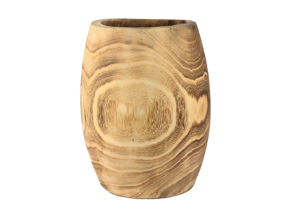 Dřevěná váza o výšce 28 cm zaujme krásnou, přirozenou kresbou dřeva, která vytváří jedinečný vzor na každém kusu. Jemně zaoblený tvar působí harmonicky a podtrhuje přírodní charakter materiálu.