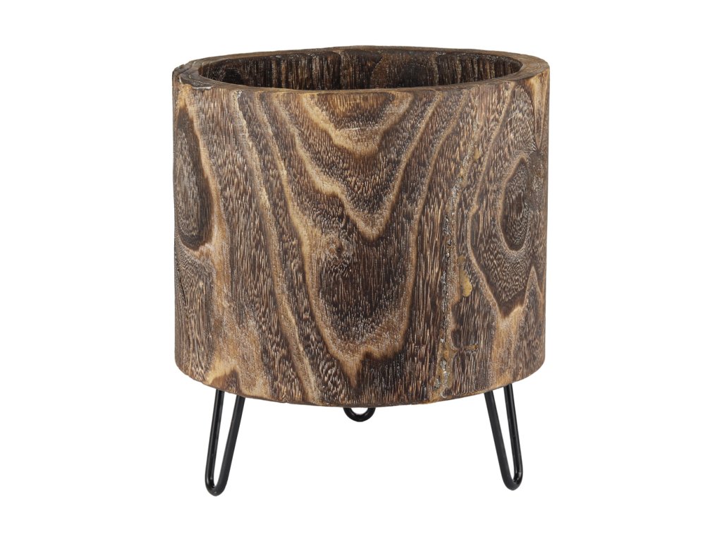 Dřevěný květináč na kovových nohách v tmavém provedení zaujme výraznou kresbou dřeva a moderním industriálním vzhledem. Stylové spojení přírodního materiálu a kovu vytvoří výrazný dekorativní prvek v každém interiéru.