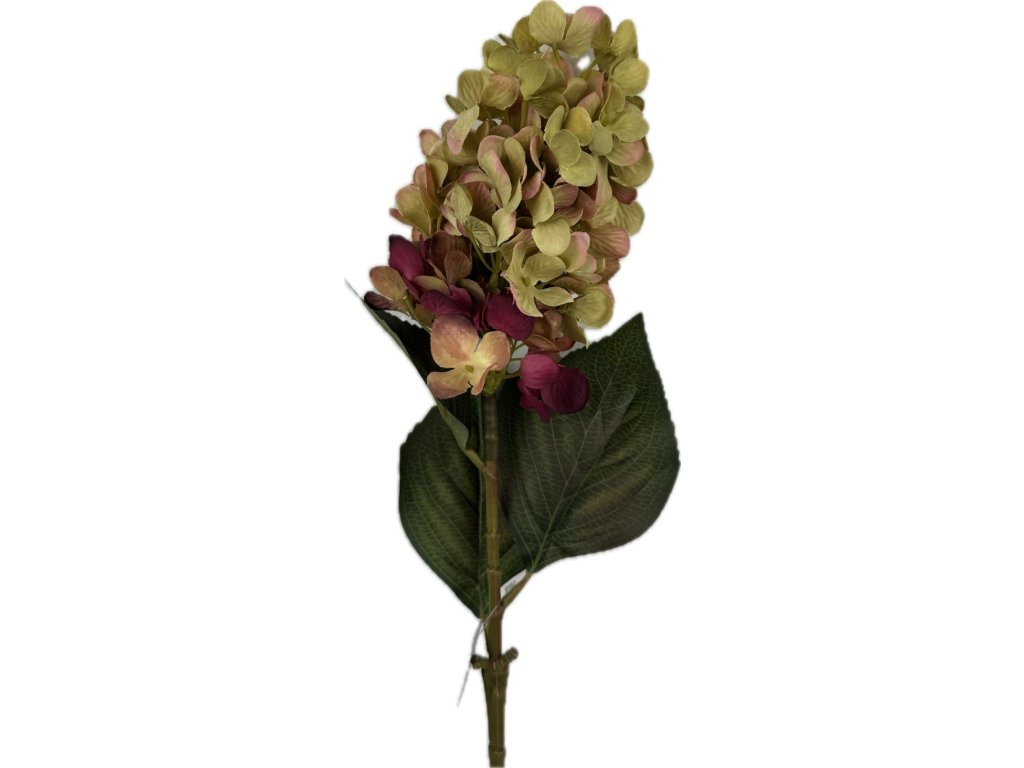 Umělá květina hortenzie o délce 72 cm v zelených tónech s jemným vínovo-růžovým nádechem. Stylová dekorace, která působí elegantně a přirozeně v každém interiéru.