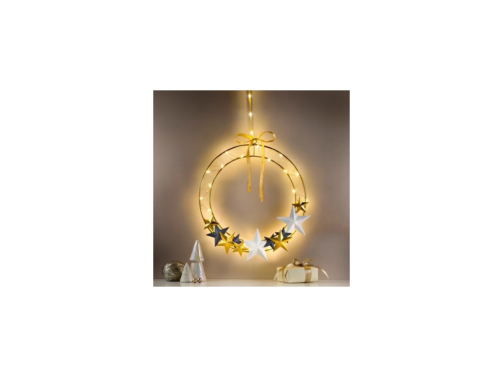 Zlatý kovový věnec s 44 teplými LED diodami a dekorativními hvězdami. Praktický 6hodinový časovač a bateriové napájení umožňují snadné zavěšení a flexibilní umístění v interiéru.