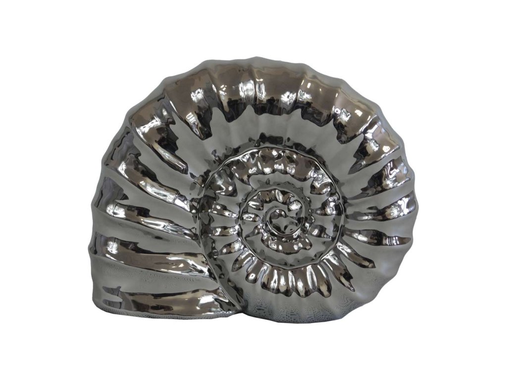 Keramická dekorace o velikosti 20 cm zaujme výrazným tvarem ulity s detailně propracovanou spirálovou strukturou. Lesklý stříbrný povrch vytváří atraktivní odlesky světla a dodává dekoraci elegantní, až glamour charakter.