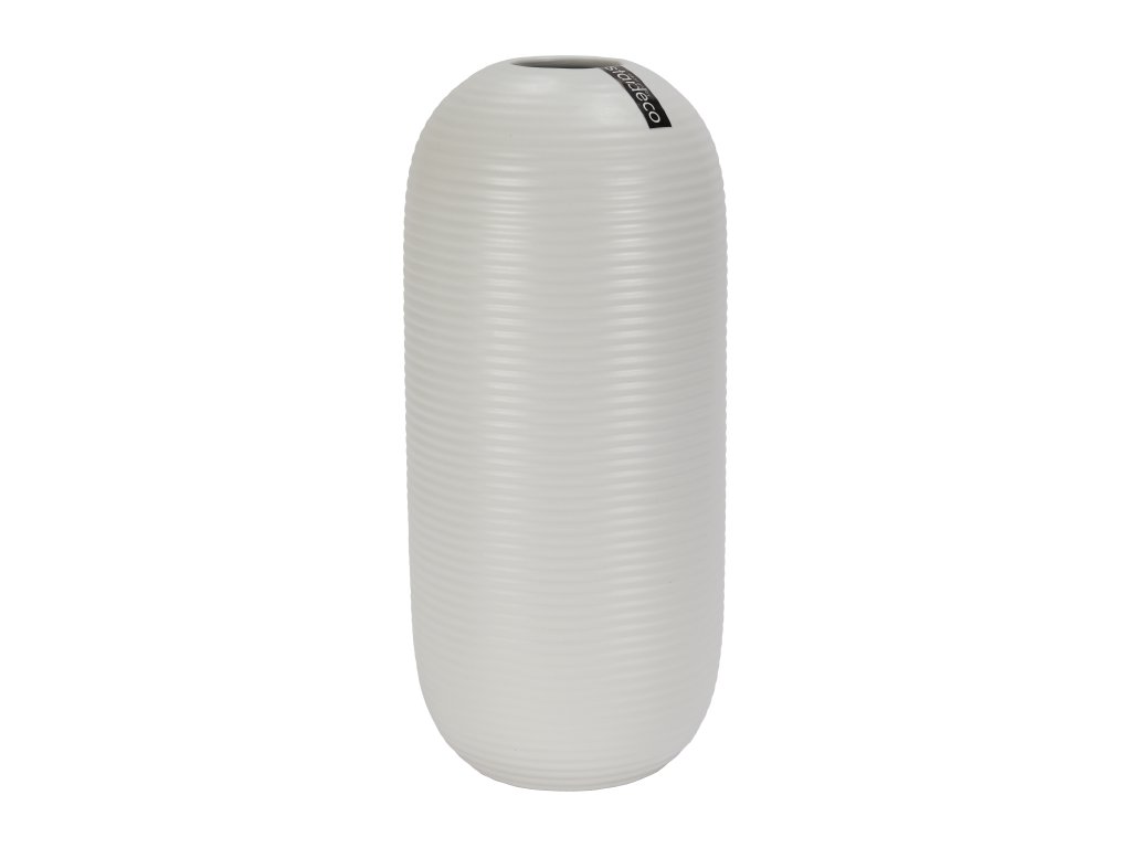 Moderní keramická váza v čistě bílé barvě s jemnou horizontální strukturou. Elegantní tvar a univerzální odstín z ní dělají nadčasový doplněk do každého interiéru.