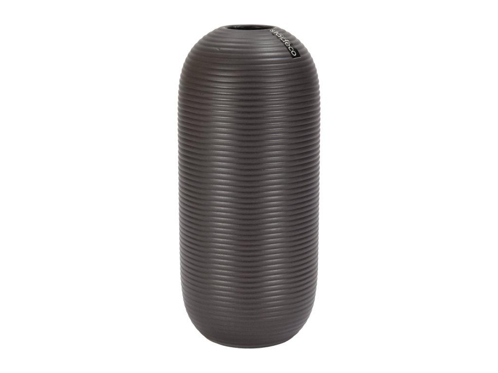 Povrch je zdoben jemným horizontálním žebrováním, které vytváří zajímavý vizuální efekt a zvýrazňuje hru světla na povrchu. Tmavý odstín krásně vynikne ve světlém interiéru, ale zároveň se harmonicky začlení i do přírodně laděných nebo moderních prostor.