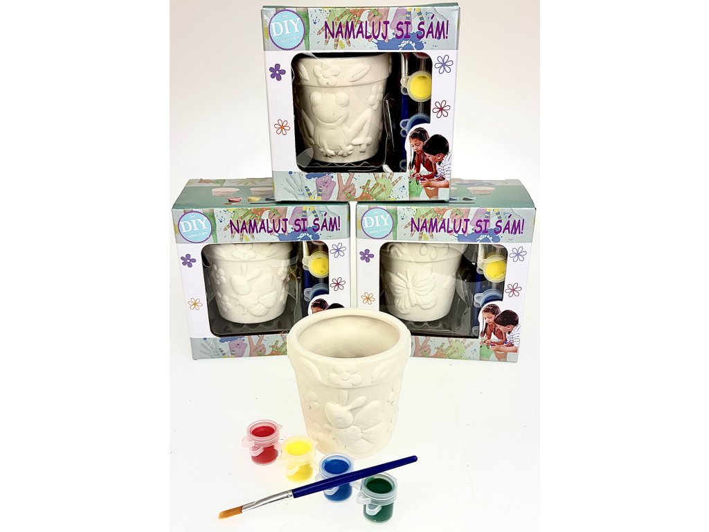 Keramický květináč 7x7cm+sada na malování pro děti /štětec+ 4x barvička/