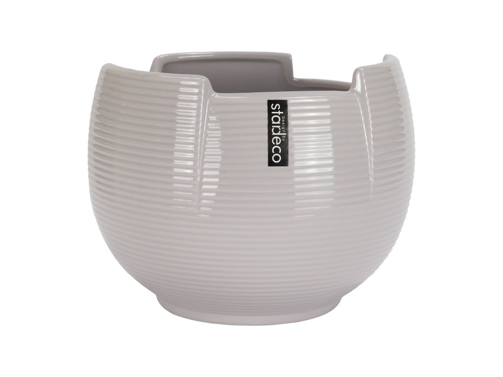 Keramický květináč o výšce 16,5 cm zaujme svým elegantním oblým tvarem a netradičně řešeným horním okrajem, který mu dodává osobitý charakter. Světle šedý odstín působí čistě, nadčasově a snadno se kombinuje s dalšími dekoracemi.