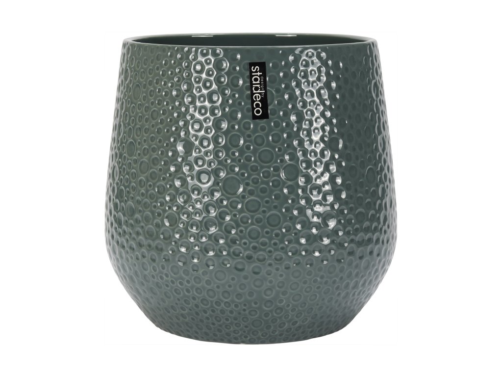 Keramický květináč o výšce 24 cm zaujme originálním reliéfním povrchem tvořeným vystouplými kruhy různých velikostí, které vytvářejí efekt kapek. Díky této plastické struktuře působí velmi dekorativně a dodává prostoru zajímavý vizuální prvek.
