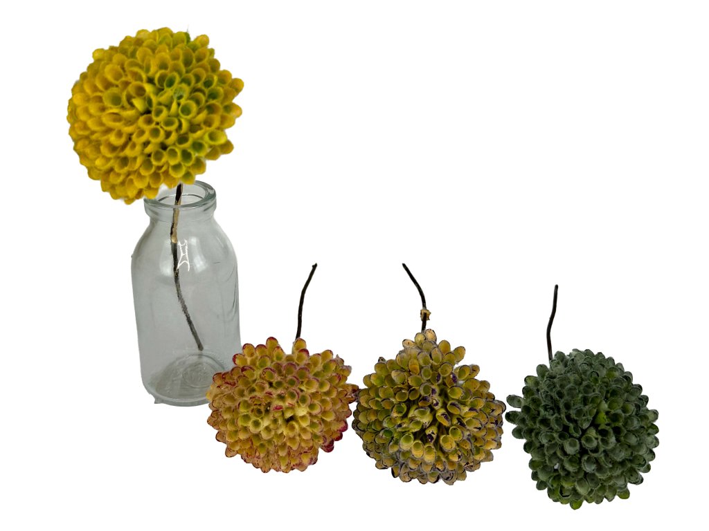 Dekorativní umělá kraspédie v podobě kulatého květu. Stylový doplněk do moderních aranžmá, balení obsahuje 12 ks.