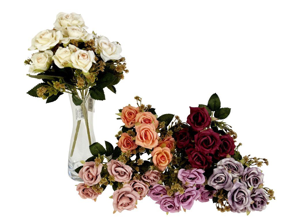 Dekorační kytice růží se šesti květy zaujme svým kompaktním tvarem a přirozeným vzhledem. Jemné květy v různých barevných odstínech doplňuje drobná zeleň, která dodává celé kompozici lehkost a harmonii.