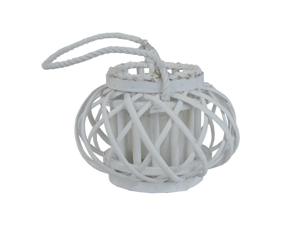 Dekorativní lucerna o výšce 17 cm je vyrobena z bíle lakovaného proutí, které vytváří zajímavý proplétaný vzor po celém obvodu. Díky otevřené konstrukci působí lehce a vzdušně a krásně rozptyluje světlo svíčky.