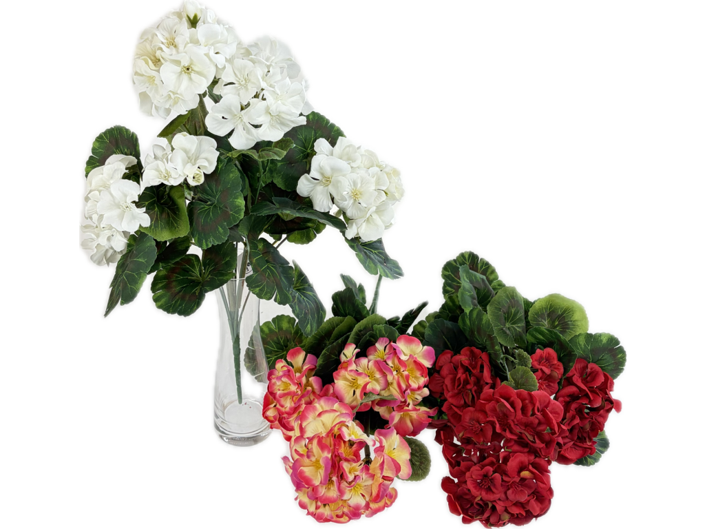 Dekorační muškát ve formě hustého trsu zaujme svými plnými květy a typickými listy, které věrně napodobují živou rostlinu. Kombinace barevných variant umožňuje snadné sladění s různými styly aranžmá a dodá prostoru živý a svěží vzhled.