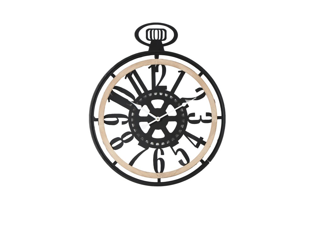 Designové nástěnné hodiny o průměru 50 cm v kombinaci černého kovu a přírodního dřeva. Originální provedení inspirované kapesními hodinkami dodá interiéru výrazný a stylový akcent.