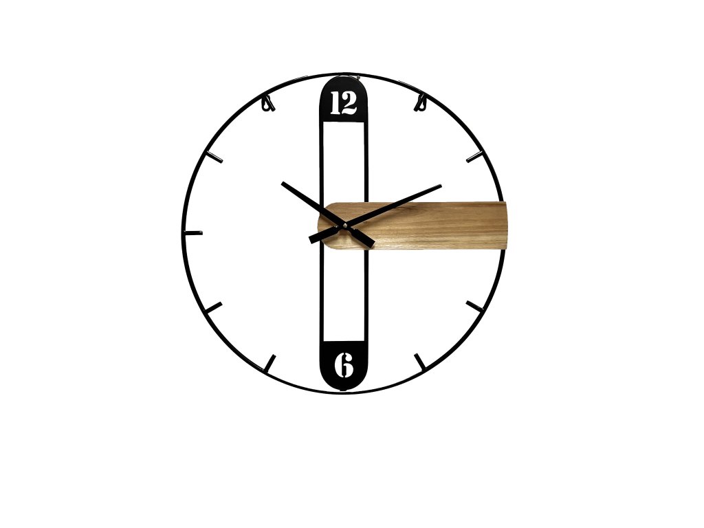 Nástěnné hodiny o průměru 60 cm představují výrazný designový prvek, který okamžitě upoutá pozornost. Černá kovová konstrukce vytváří lehký otevřený kruh s decentními indexy, zatímco dřevěný prvek procházející středem hodin přináší přírodní kontrast materiálů.