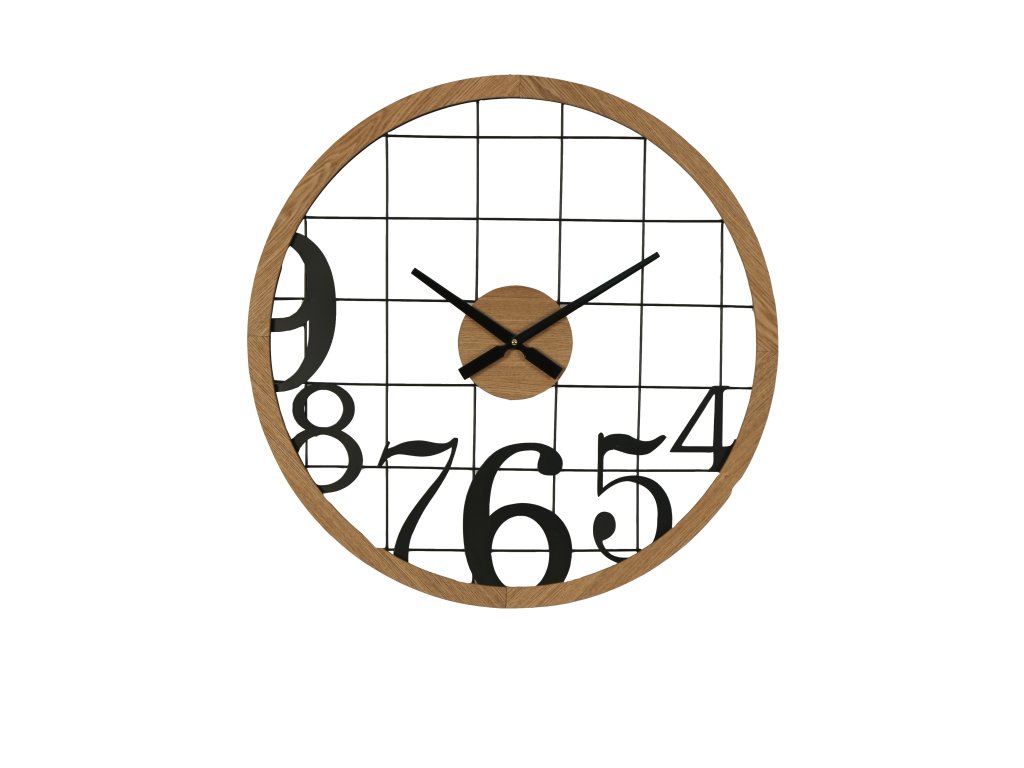 Stylové nástěnné hodiny o průměru 60 cm zaujmou na první pohled svým originálním zpracováním. Přírodní dřevěný rám krásně kontrastuje s černou kovovou mřížkou a výraznými číslicemi, které dodávají hodinám moderní industriální charakter.