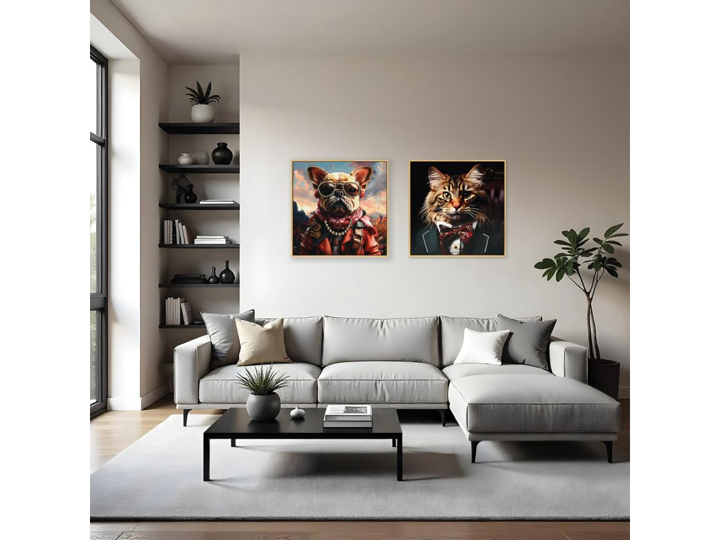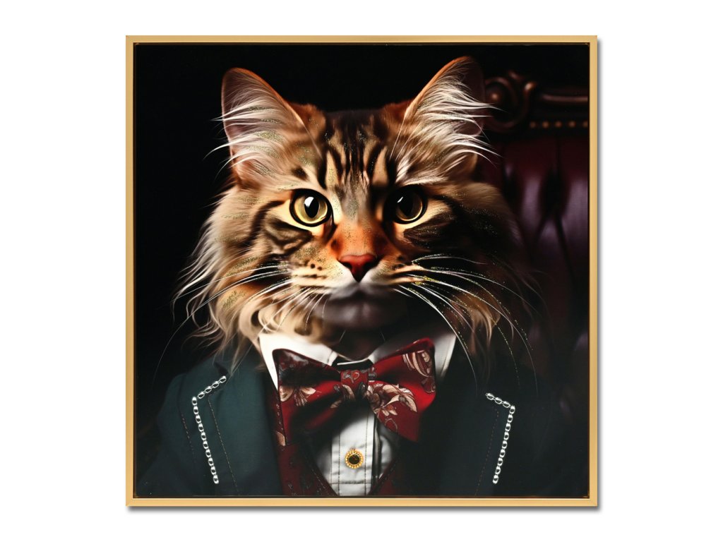 Obraz o rozměrech 52,5 × 52,5 cm představuje spojení noblesy, originality a moderního umění. Motiv kočky v elegantním obleku s výrazným motýlkem působí stylově, sebevědomě a lehce extravagantně. Kombinace tmavého pozadí a teplých tónů srsti vytváří výrazný kontrast, který přitahuje pozornost.