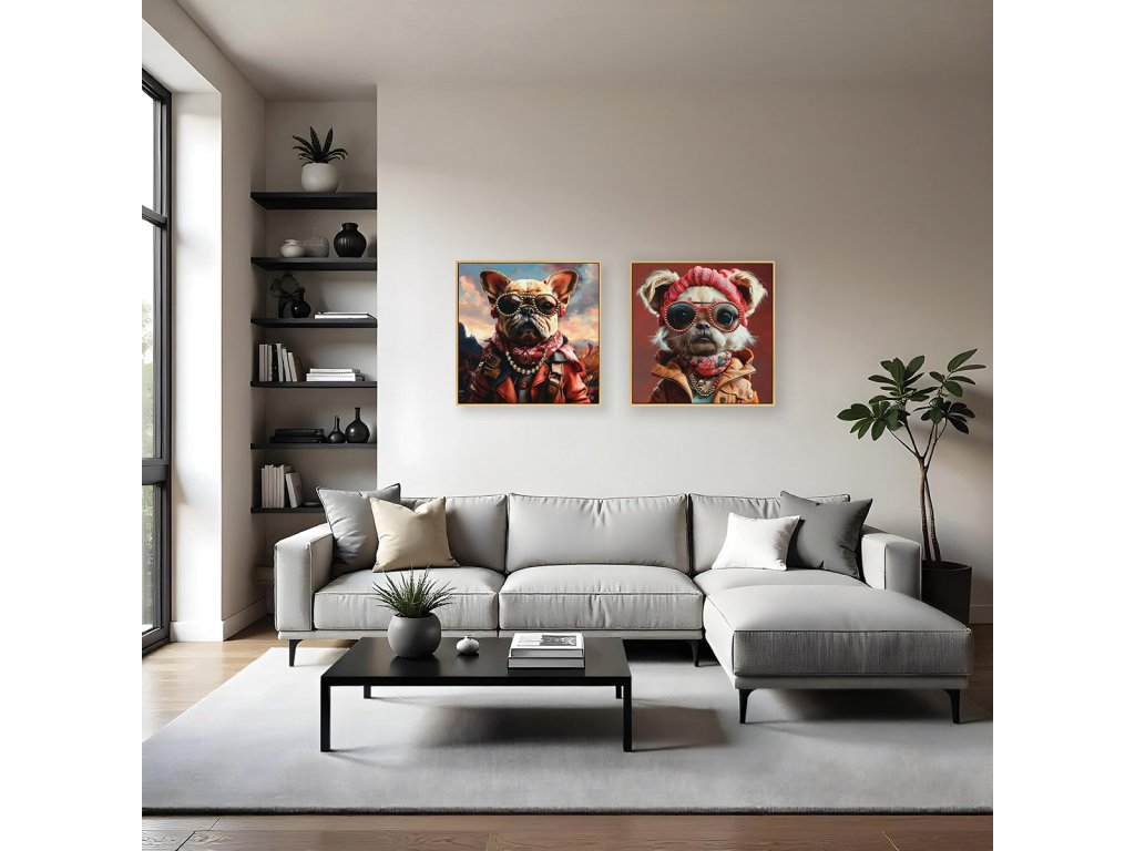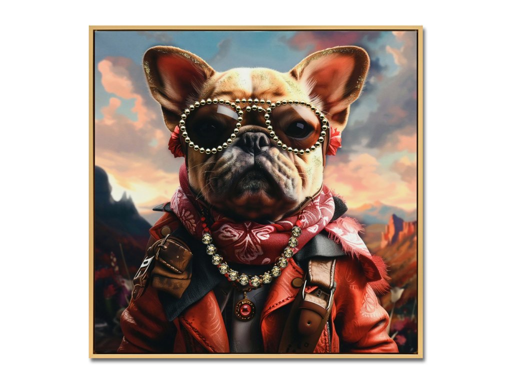 Obraz o rozměrech 52,5 × 52,5 cm přináší originální spojení elegance, hravosti a moderního umění. Motiv stylově oblečeného buldočka s výraznými doplňky působí sebevědomě, luxusně a zároveň s nadsázkou. Teplé tóny červené v kombinaci s jemně tónovaným pozadím vytvářejí harmonickou, ale výraznou kompozici.