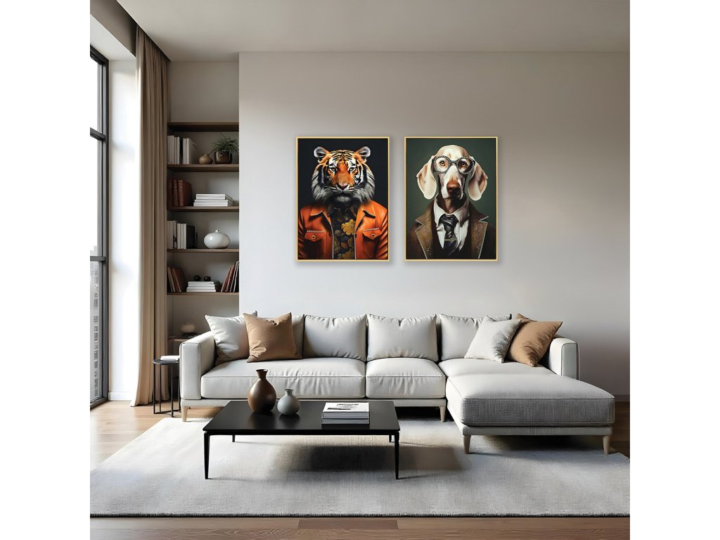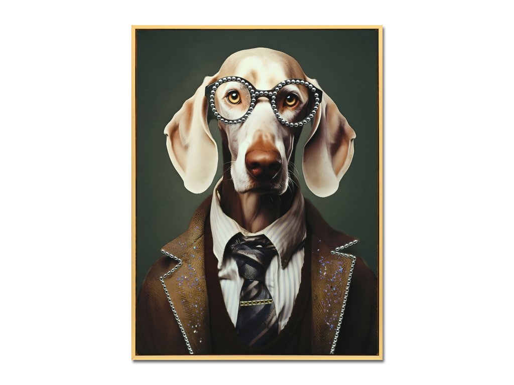 Obraz o rozměrech 52,5 × 72,5 cm představuje originální spojení elegance, humoru a moderního designu. Motiv psa v brýlích a formálním obleku působí inteligentně, stylově a s lehkou dávkou nadsázky. Tlumené zelené pozadí podtrhuje světlé tóny srsti a vytváří harmonickou, vyváženou kompozici.