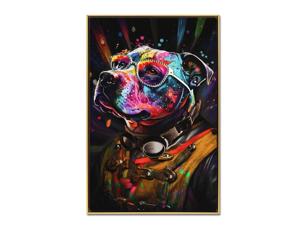 Obraz o rozměrech 62 × 92 cm přináší odvážnou kombinaci moderního umění a výrazného portrétního stylu. Motiv psa v pilotních brýlích je zpracován v intenzivních barevných tónech, které vytvářejí dramatický kontrast s temným pozadím.