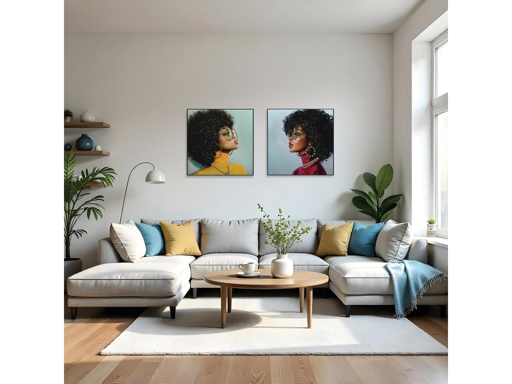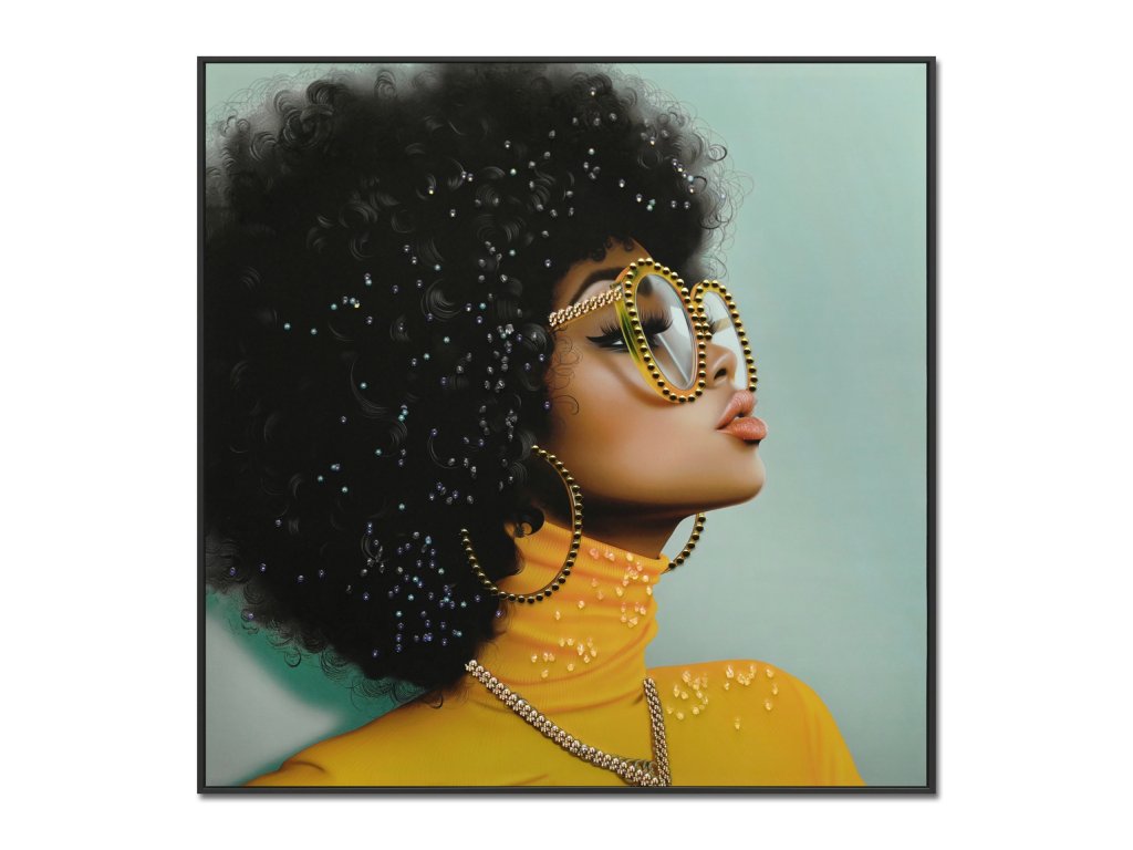 Lakovaný obraz o rozměrech 82 × 82 cm představuje stylizovaný portrét sebevědomé ženy v moderním pojetí. Výrazná žlutá barva oděvu kontrastuje s tmavými tóny vlasů a jemným zelenkavým pozadím, čímž vzniká harmonická, ale zároveň velmi působivá kompozice.