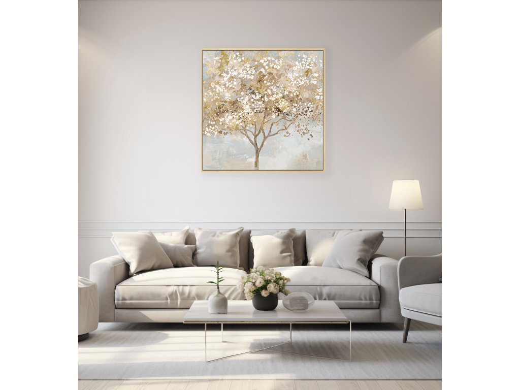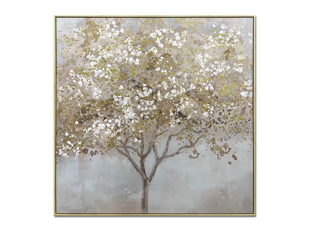 Ručně malovaný obraz o rozměrech 100 × 100 cm zachycuje kvetoucí strom v harmonické kombinaci béžových, šedých a bílých tónů, které jsou doplněny jemnými zlatými akcenty. Zlaté detaily decentně odrážejí světlo a dodávají obrazu luxusní nádech.