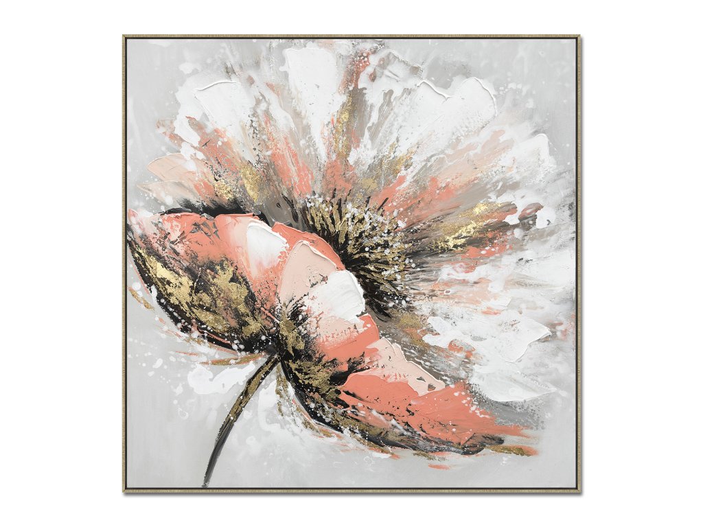 Ručně malovaný obraz s motivem květu v moderním abstraktním pojetí zaujme výraznou strukturou a harmonickou kombinací korálových, bílých a zlatých tónů. Plastické vrstvy barvy dodávají dílu hloubku a luxusní charakter.