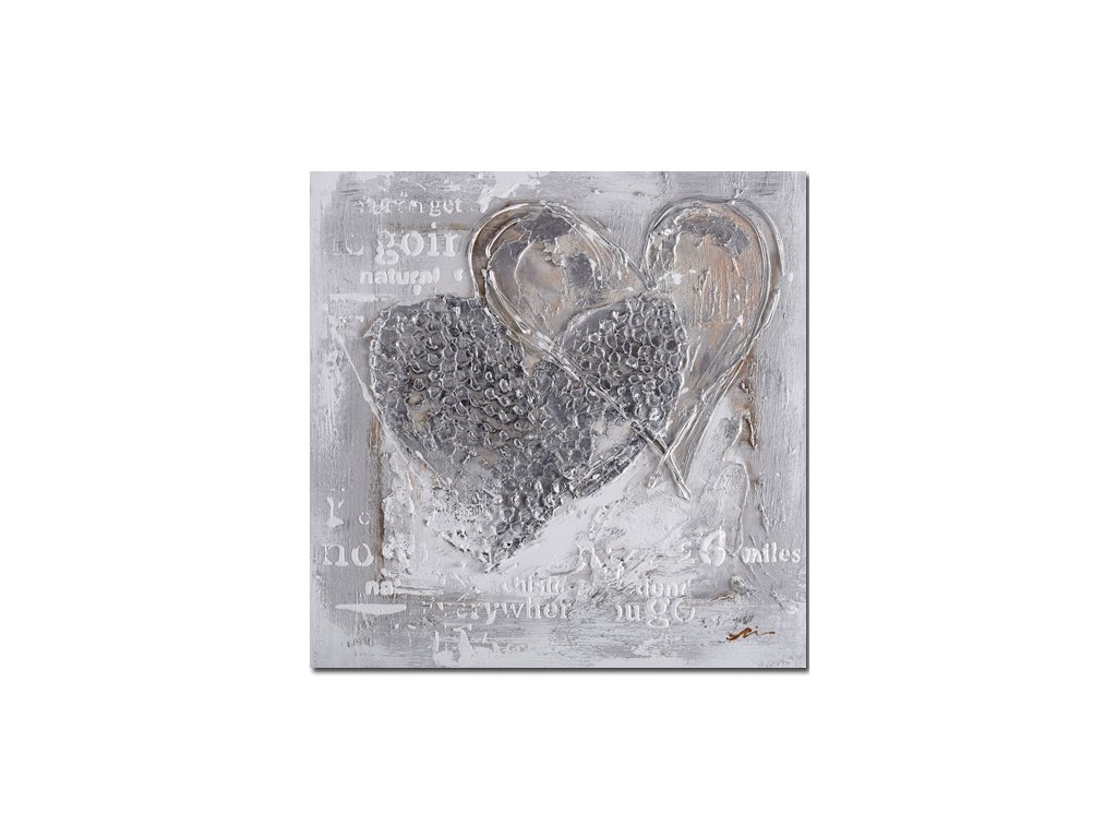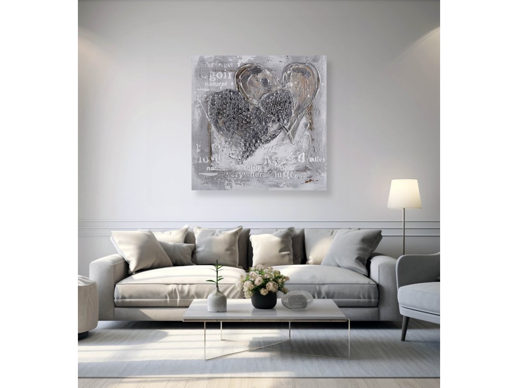Ručně malovaný obraz na plátně o rozměrech 100 × 100 cm zachycuje motiv dvou srdcí zpracovaný pomocí bohatých strukturálních vrstev a jemných reliéfních detailů. Neutrální barevnost v kombinaci s decentními stříbrnými akcenty dodává obrazu hloubku, jemnost a moderní eleganci.