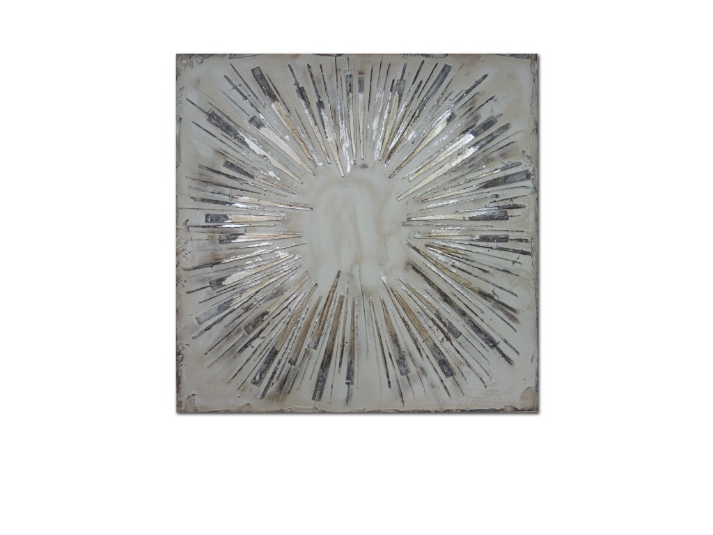 Ručně malovaný obraz na plátně o rozměrech 100 × 100 cm zaujme výrazným abstraktním motivem paprsků, které se rozbíhají ze středu obrazu. Plastické vrstvy barvy v odstínech béžové, šedé a stříbrné vytvářejí hloubku a zajímavou hru světla, díky které obraz působí živě a dynamicky.