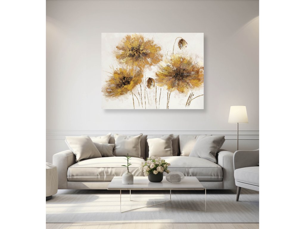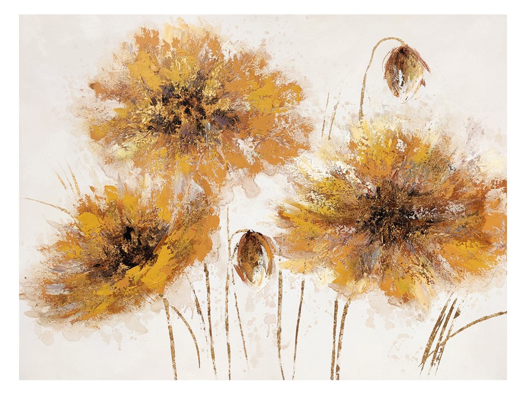 Ručně malovaný obraz na plátně s výrazným květinovým motivem zaujme bohatou strukturou, dynamickými tahy a teplou barevností. Kombinace zlatavých, okrových a hnědých tónů vytváří energický, hřejivý a zároveň elegantní vizuální dojem.