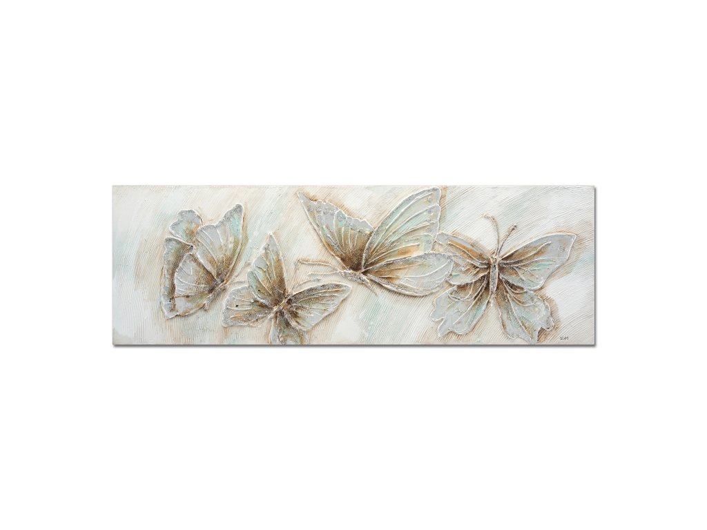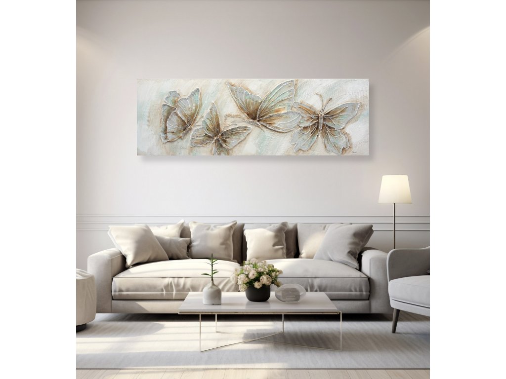 Ručně malovaný obraz na plátně o rozměrech 40 × 120 cm zaujme kompozicí elegantních motýlů v jemných přírodních tónech. Barevná paleta kombinuje krémovou, béžovou a nádech světle tyrkysové, které společně vytvářejí harmonický a svěží dojem.