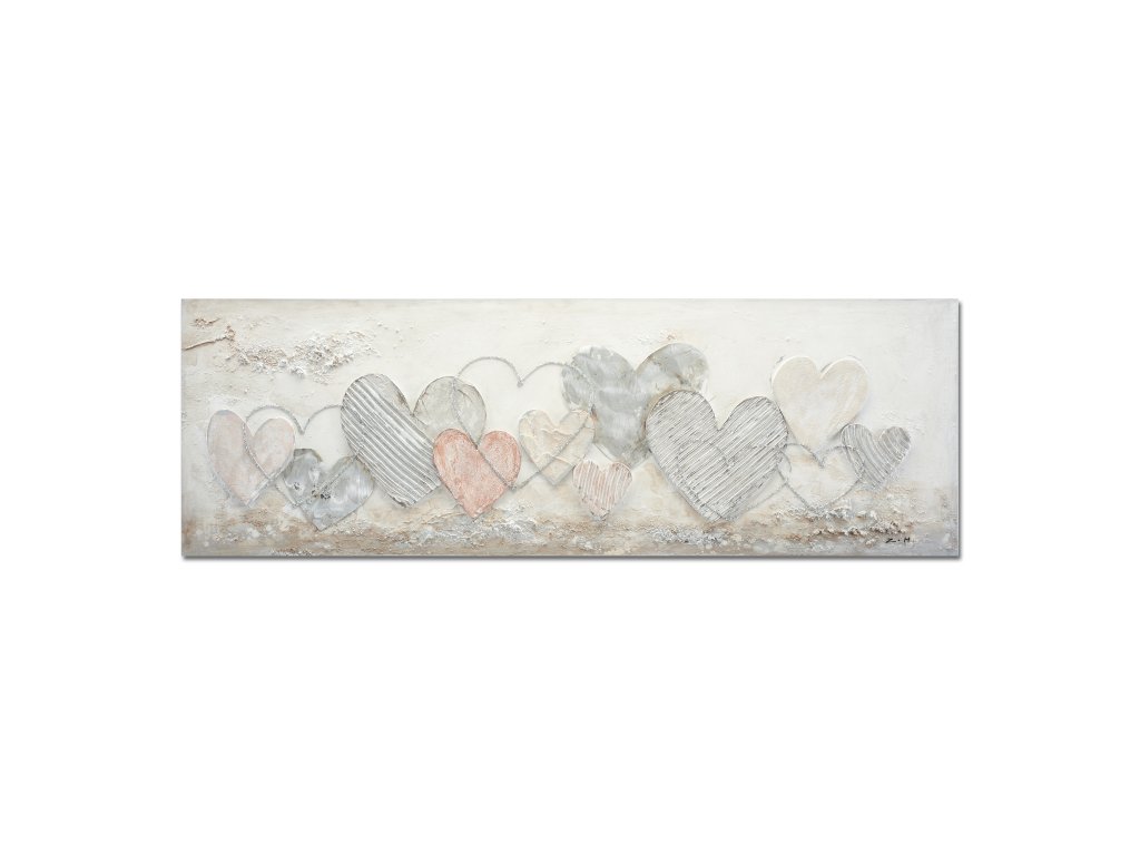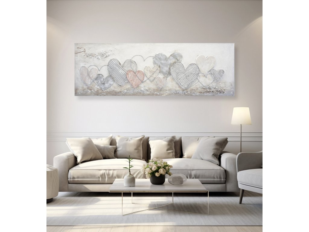 Ručně malovaný obraz na plátně o rozměrech 40 × 120 cm zaujme kompozicí dekorativních srdcí v jemné přírodní barevné paletě. Odstíny krémové, béžové, světle šedé a náznaky pastelově růžové vytvářejí harmonický a klidný celek.