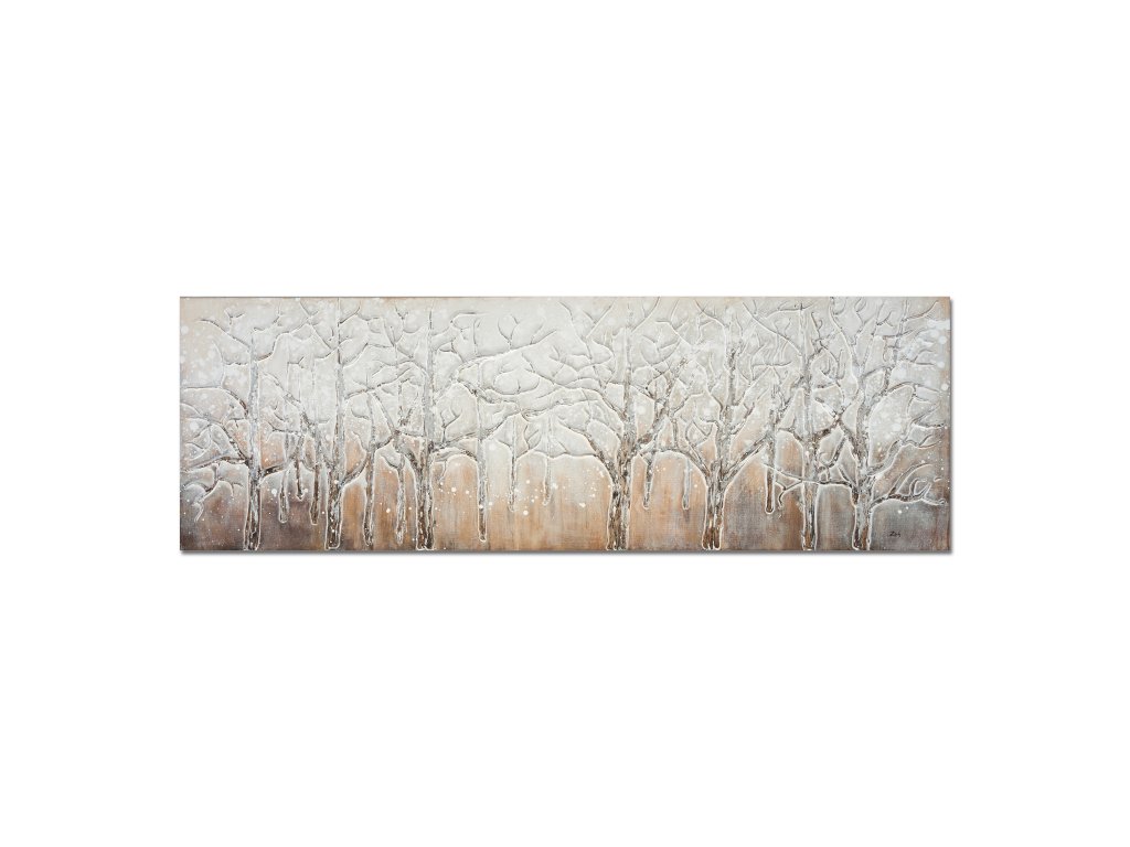 Ručně malovaný obraz na plátně o rozměrech 40 × 120 cm zachycuje stylizované stromy s výraznou plastickou strukturou větví. Jemná barevná paleta v odstínech krémové, béžové a světle hnědé vytváří klidnou a harmonickou atmosféru.
