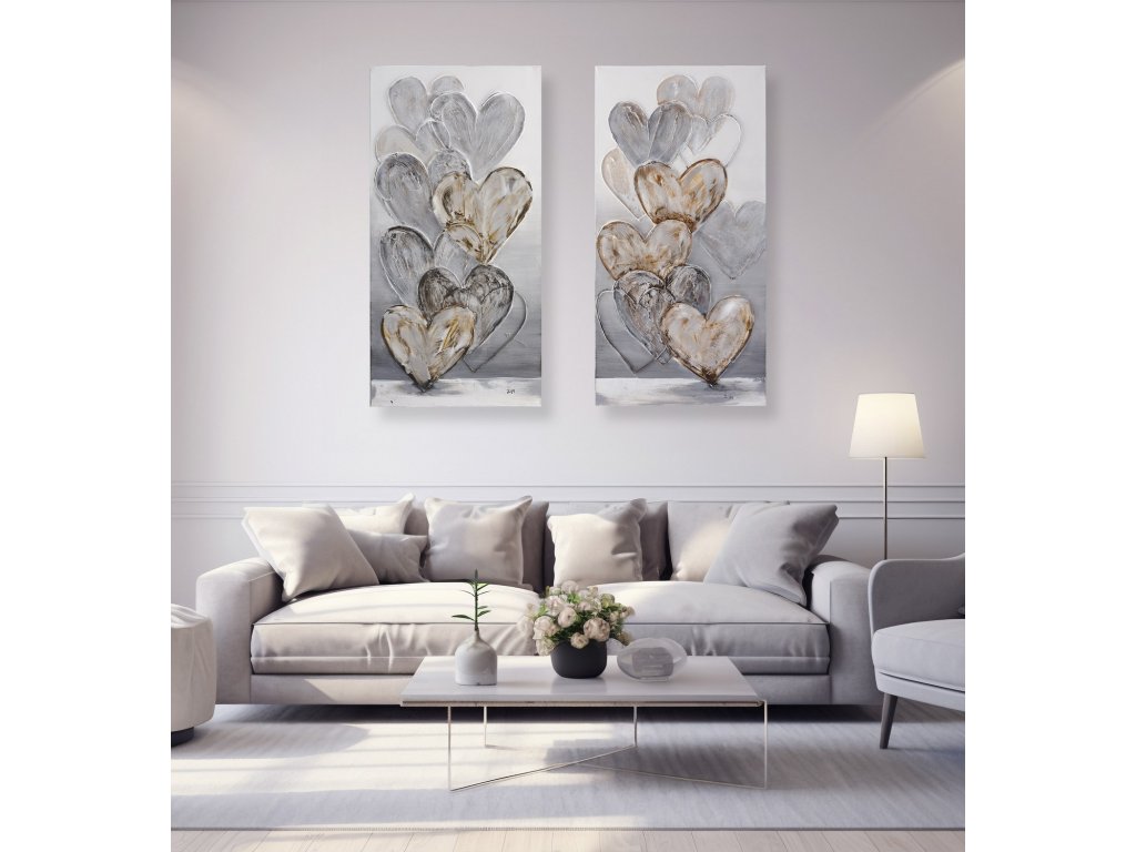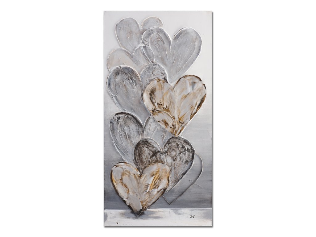 Ručně malovaný obraz na plátně o rozměrech 40 × 80 cm zaujme kompozicí překrývajících se srdcí v jemné přírodní barevné paletě. Odstíny béžové, šedé a teplé hnědé jsou doplněny zlatými akcenty, které podtrhují elegantní charakter díla.