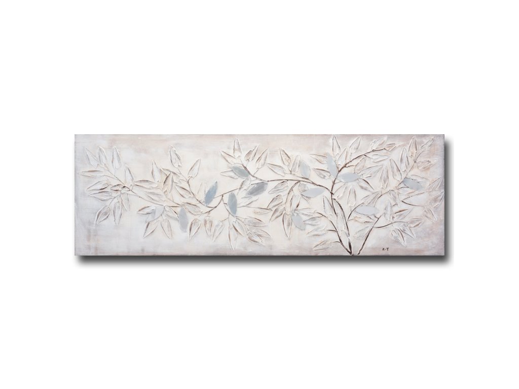 Ručně malovaný obraz na plátně o rozměrech 50 × 150 cm zachycuje stylizovaný motiv větviček s listy zpracovaný pomocí jemných plastických vrstev a reliéfních tahů. Světlý podklad v kombinaci s krémovými, šedými a lehce přírodními tóny dodává obrazu lehkost, harmonii a jemnou hloubku.