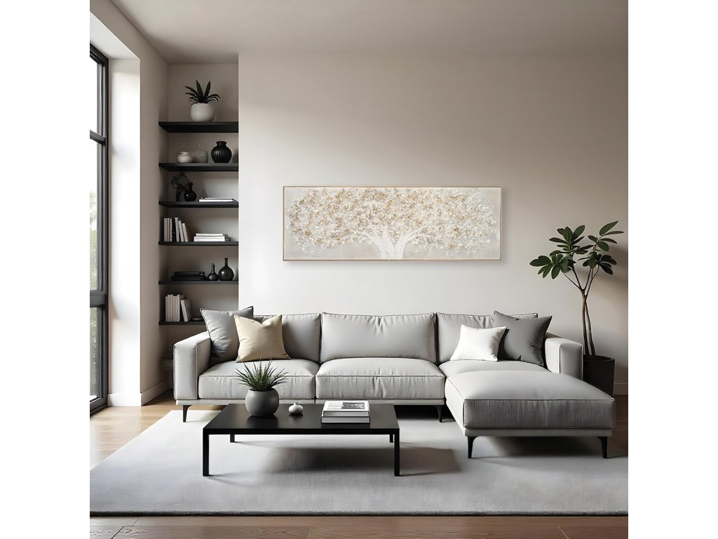 Obraz o rozměrech 52 × 152 cm představuje symbol stability, růstu a klidu v elegantním, minimalistickém pojetí. Široký horizontální formát krásně vynikne nad pohovkou, postelí, komodou nebo v jídelním prostoru.