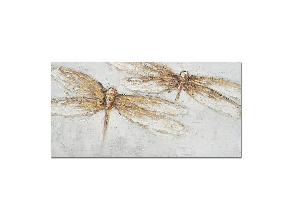 Ručně malovaný obraz v jemném přírodním stylu zachycuje dvojici vážek v elegantním, lehce abstraktním pojetí. Plastická struktura a zlatavé akcenty dodávají obrazu hloubku a luxusní nádech.