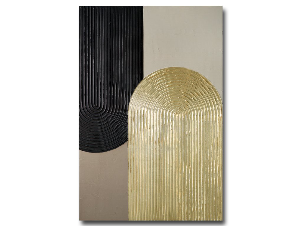 Ručně malovaný obraz na plátně o rozměrech 40 × 60 cm pracuje s čistou geometrií, kontrastem a strukturou. Plastické reliéfní linie v kombinaci se zlatými metalickými akcenty vytvářejí výraznou hloubku a sofistikovaný efekt, který se mění podle dopadu světla.