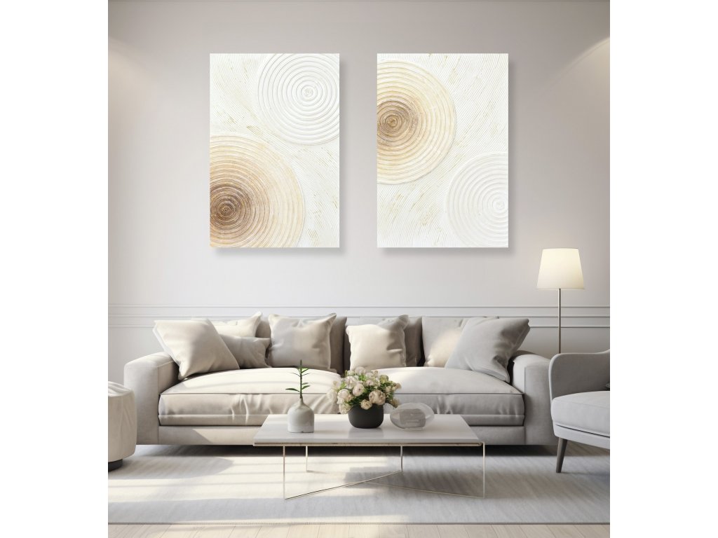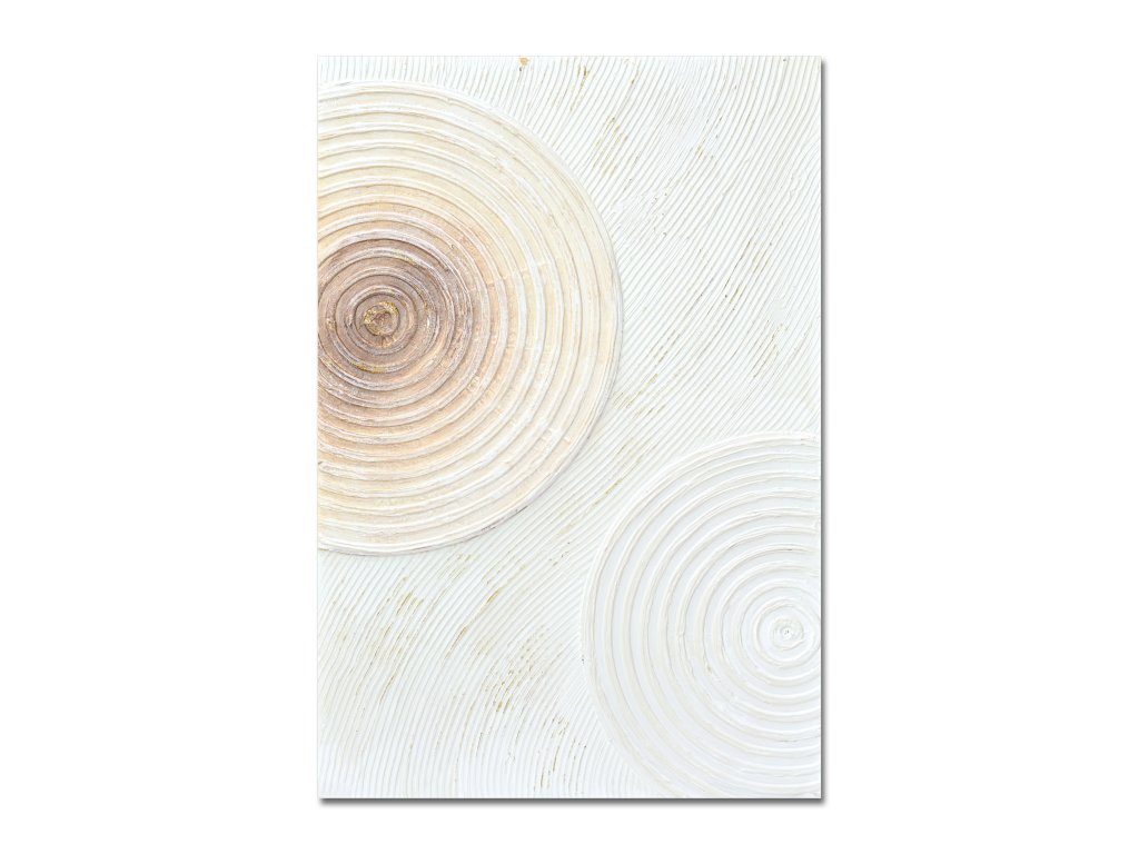 Ručně malovaný obraz na plátně v jemných krémových a béžových tónech s kruhovým plastickým motivem působí harmonicky a elegantně. Reliéfní struktura a decentní zlaté akcenty dodávají obrazu hloubku a sofistikovaný vzhled.
