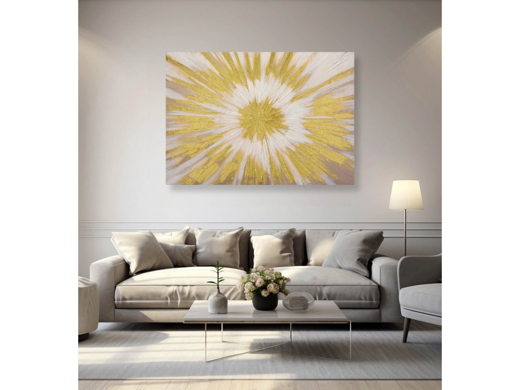 Ručně malovaný obraz na plátně o rozměrech 70 × 100 cm zachycuje abstraktní kompozici vycházející ze středu obrazu, odkud se dynamicky rozbíhají vrstvy barvy a zlatých akcentů. Plastická struktura a metalické detaily vytvářejí výraznou hloubku a efektní hru světla, která se mění podle dopadu osvětlení.