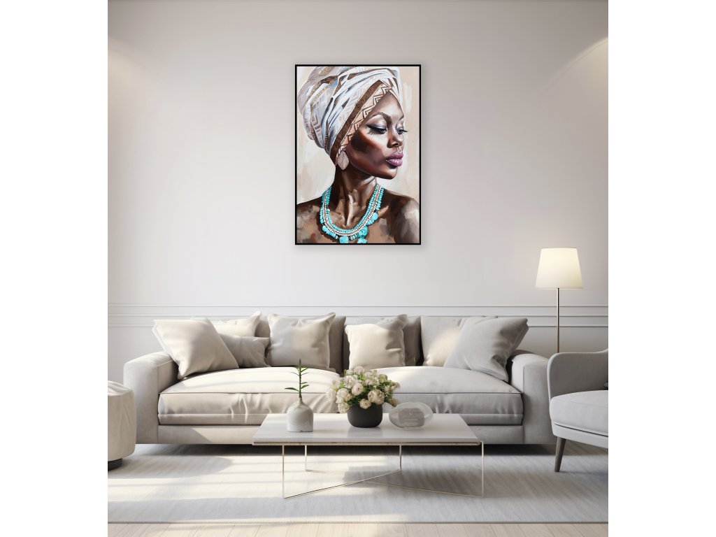 Ručně malovaný obraz na plátně o rozměrech 70 × 100 cm zaujme detailně zpracovaným portrétem ženy v jemné, harmonické barevné paletě. Odstíny béžové a hnědé vytvářejí teplý základ, který je doplněn výraznými tyrkysovými akcenty na náhrdelníku, dodávajícími obrazu svěží kontrast.