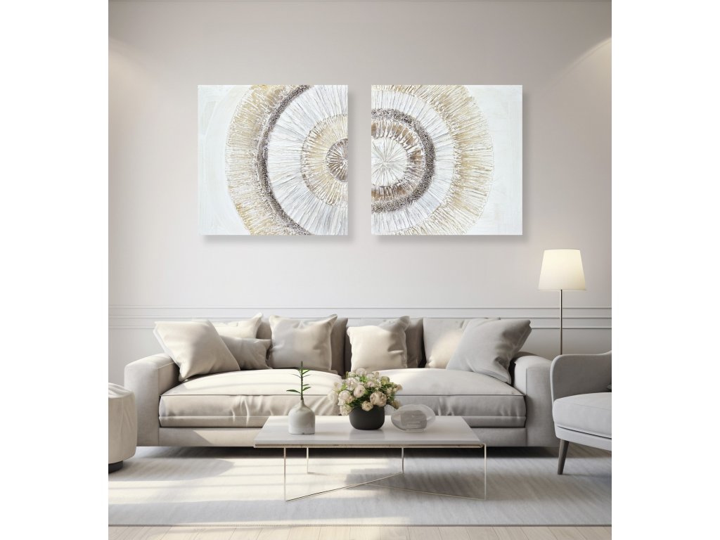 Ručně malovaný obraz na plátně o rozměrech 80 × 80 cm zaujme sofistikovanou abstraktní kompozicí tvořenou soustřednými kruhy s výraznou plastickou strukturou. Jemné přechody mezi béžovými, krémovými a světle zlatými tóny vytvářejí harmonický celek, který působí klidně a vyváženě.