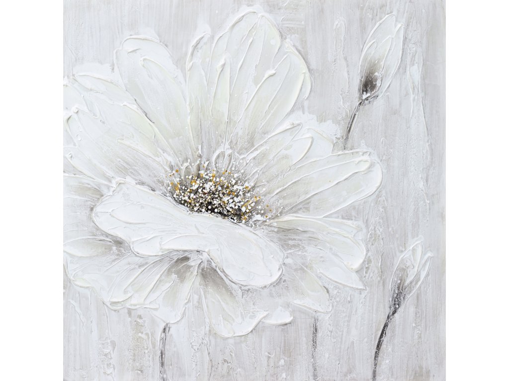 Ručně malovaný obraz na plátně o rozměrech 80 × 80 cm zaujme výrazným plastickým zpracováním květu v jemných bílých a šedých odstínech. Reliéfní tahy zvýrazňují jednotlivé okvětní lístky a vytvářejí přirozený efekt hloubky a pohybu.