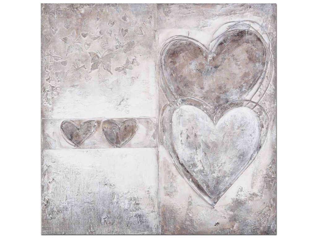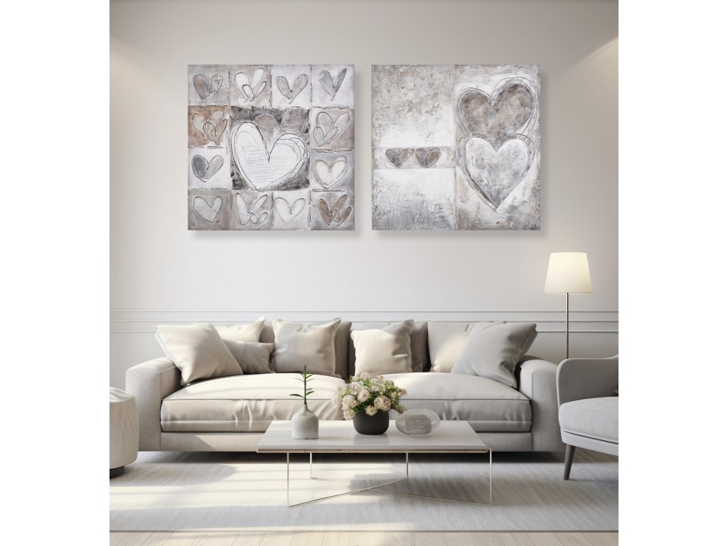 Ručně malovaný obraz na plátně o rozměrech 80 × 80 cm je nadčasovou dekorací, která dodá interiéru klid, eleganci a jemný emocionální akcent. Motiv srdcí v decentních šedých a béžových tónech působí harmonicky a vkusně, aniž by narušoval celkový charakter prostoru.
