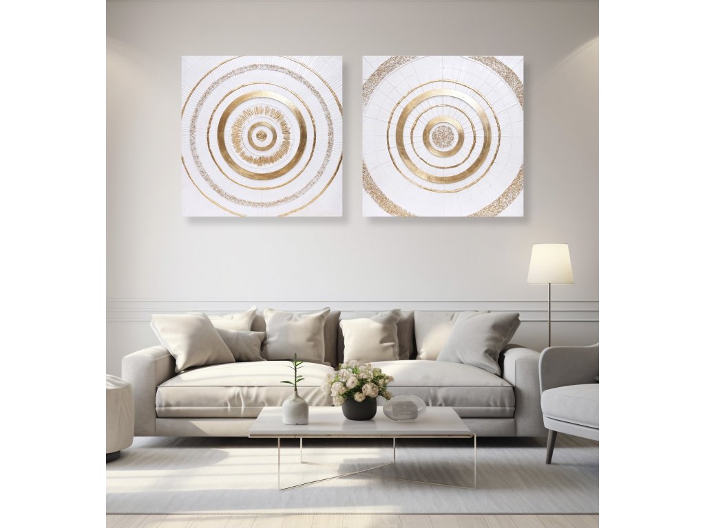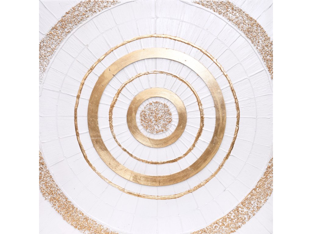Ručně malovaný obraz na plátně o rozměrech 82 × 82 cm zaujme precizně vrstvenou abstraktní kompozicí tvořenou soustřednými kruhy ve zlaté barvě na světlém podkladu. Plastická struktura vytváří jemnou hru světla a stínu, díky které obraz působí živě a mění svůj charakter podle intenzity osvětlení.
