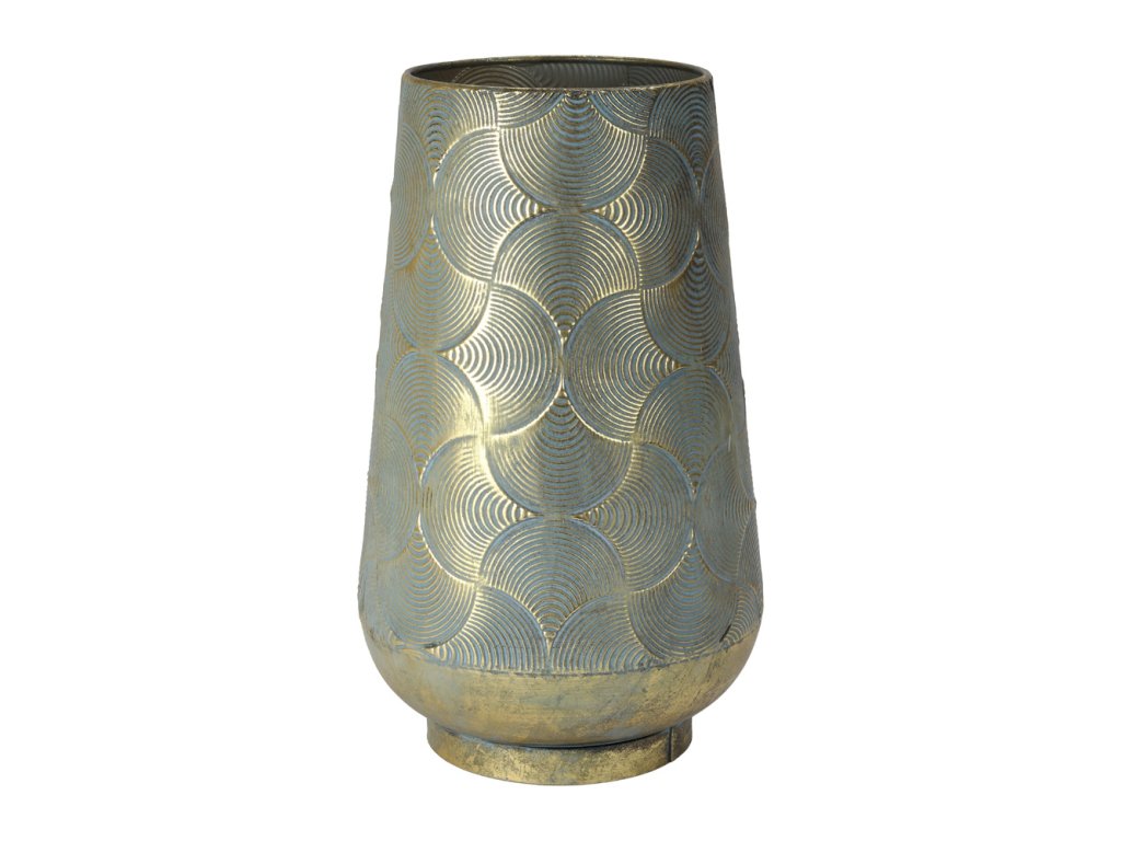 Plechová váza o výšce 35 cm zaujme výrazným reliéfním vzorem inspirovaným geometrickými oblouky. Kombinace tlumeného modrozeleného odstínu se zlatou patinou vytváří elegantní kontrast a jemný vintage efekt.