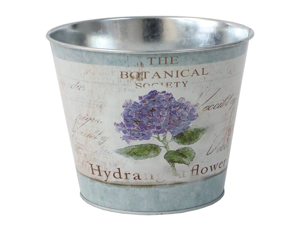 Plechový květináč o průměru 16,5 cm s jemným botanickým motivem hortenzie. Stylový doplněk ve vintage provedení, který dodá interiéru i terase romantický a svěží vzhled.