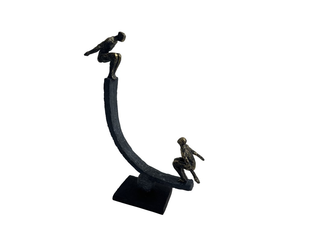Originální polyresinová dekorace o výšce 37 cm představuje dvojici postav zachycených v pohybu na výrazně zakřiveném oblouku. Kompozice působí dynamicky a může symbolizovat rovnováhu, spolupráci nebo životní výzvy.