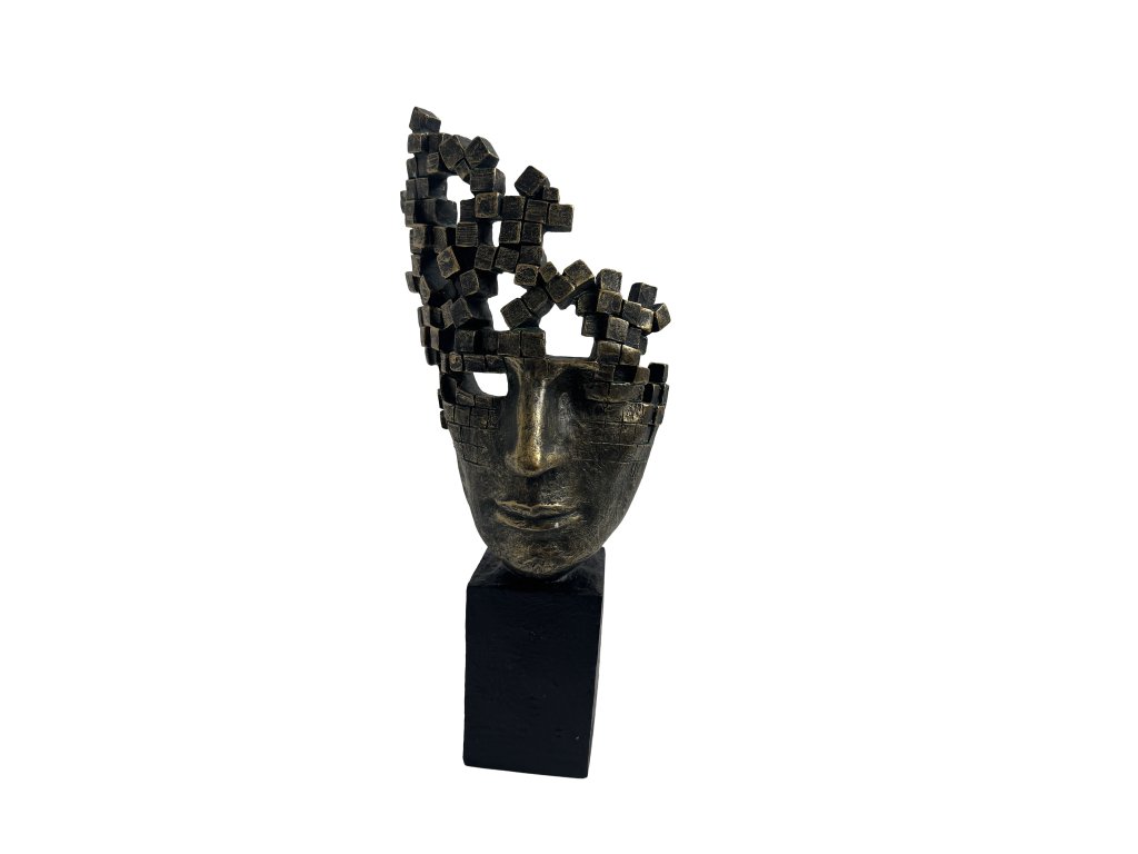 Originální polyresinová dekorace o výšce 38,5 cm představuje stylizovanou tvář doplněnou o výrazný abstraktní prvek tvořený strukturou kostek. Kombinace tmavého základu a jemné bronzové patiny dodává dekoraci elegantní a zároveň lehce industriální vzhled.