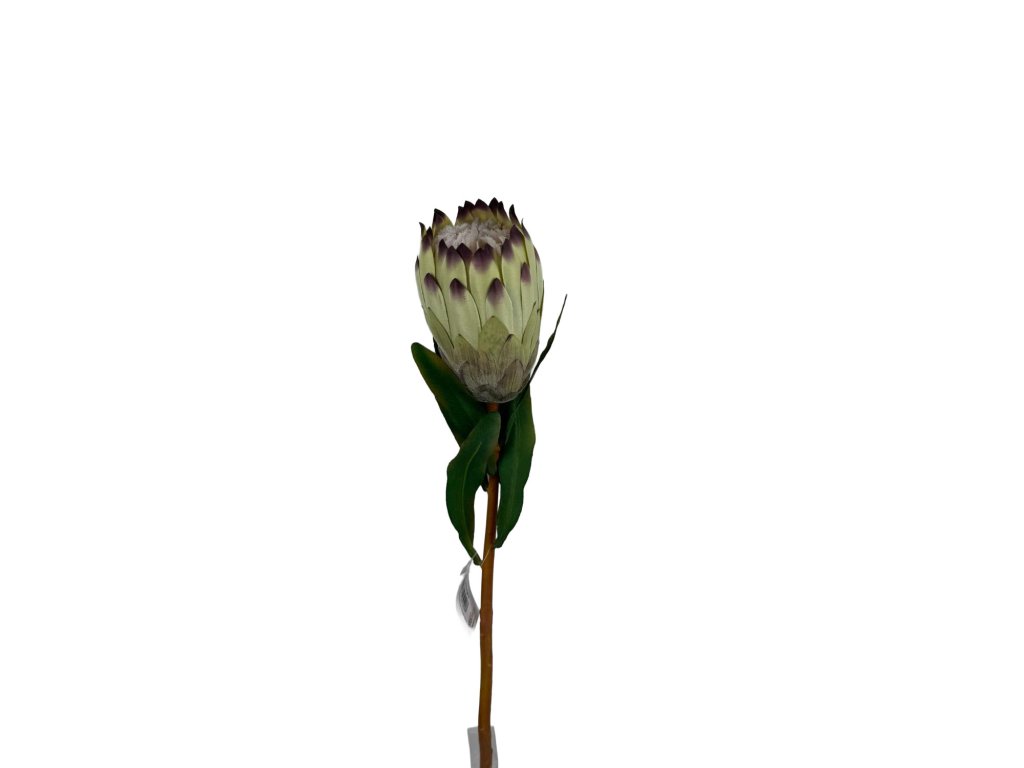 Umělá květina protea o délce 65 cm v krémovo-zeleném provedení s jemně fialovým tónováním špiček. Elegantní exotická dekorace s výraznou strukturou.
